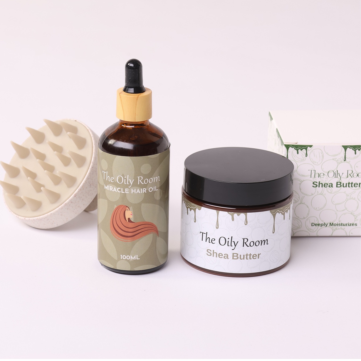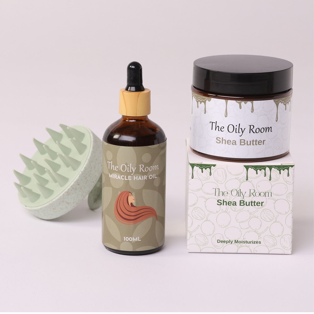 Meet The Ultimate Hydration Bundle – your go-to for silky soft skin and nourished hair! With our rich shea butter for smooth, hydrated body skin, nourishing hair oil for shine and softness, and a scalp massager to boost circulation, this bundle is the ultimate pampering experience. Treat yourself to head-to-toe hydration and glow all day .